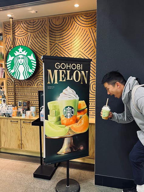 — Stephanie’s dad, uncle William, is a retired Starbucks partner so of course we have to support the family biz while traveling. Asher enjoyed a melon frappuccino on the day of its release in Japan.