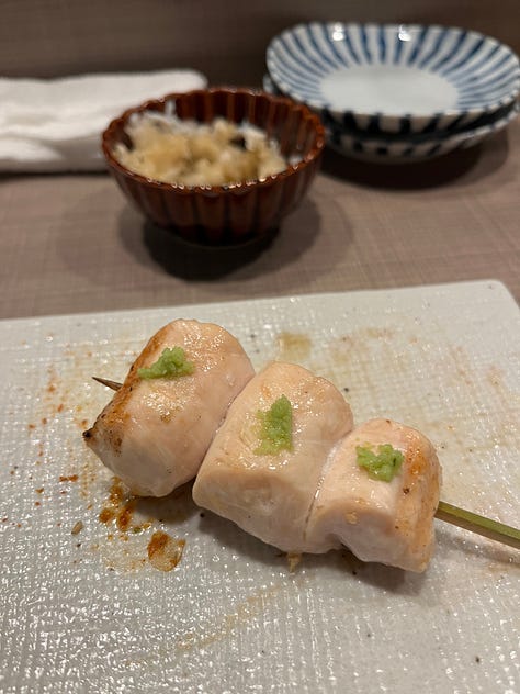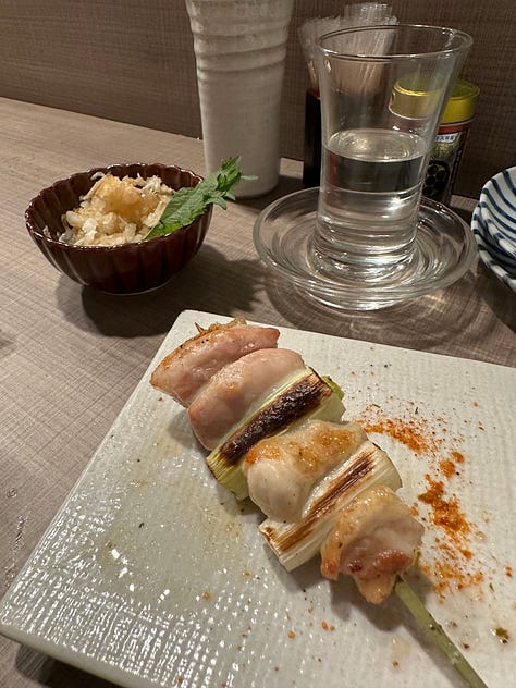 Yakitori dinner under the train tracks at 焼き鳥と酒 ヒトツナギ as our last dinner in Tokyo with Andrew, Alice, and Ada.